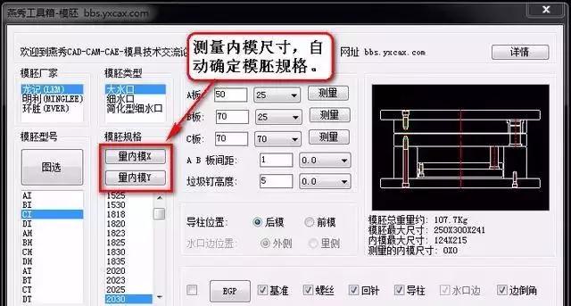 這個方法最大的好處就是不需要自己去計算,這個軟件掛幫助我們計算了,第二個方法就是根據模仁長寬與標準模架長寬的對應關系來確定模胚大小。就寬度來講,模架所能容納的模仁寬度近似于頂針板的寬度,最好就是模仁寬度比頂針板的寬度要小5-10mm。或者模架寬度=模仁寬度/(0.6-0.7)