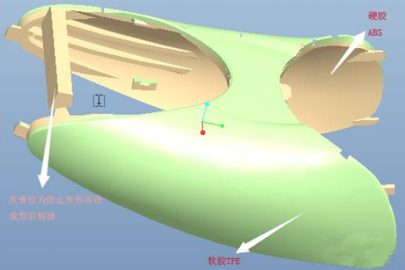 硬膠ABS采用兩點進膠,一點位于塑件頂部,成型后被軟膠TPE所覆蓋,另一點在工藝骨位上,最后被剪掉。軟膠TPE一點進膠,同樣在塑件的頂部邊緣,成型后產品組裝時可以被蓋住。