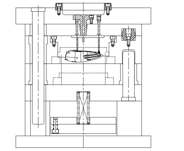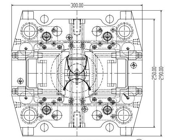 兩套模胚的雙色模具,具有兩個完全相同的后模,而兩個前模型腔是不同的,用于注射不同的物料。這就要求兩套模胚完全相同,由于需要互換配合,模胚需要具備很高的精度。一般要求模具的加工精度在0.01以內。注意模胚的導柱導套孔仍然需要基準角偏置,以防加工時出錯,和普通單色模具一樣。另外一點需要注意的是模具必須設計成三板模的形式,在一次注塑后,二次注塑前,水口料需要及時分離。